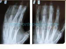 Рентгенограмма до операции - деформация сустава 4 пальца кисти, наличие фиксаторов после предадущей операции |