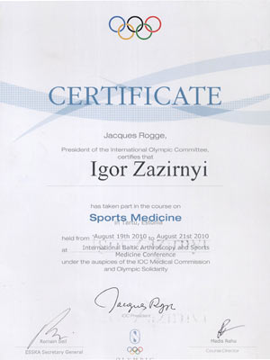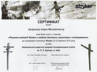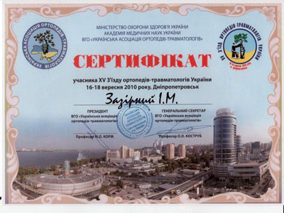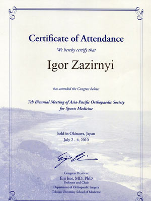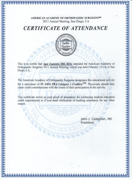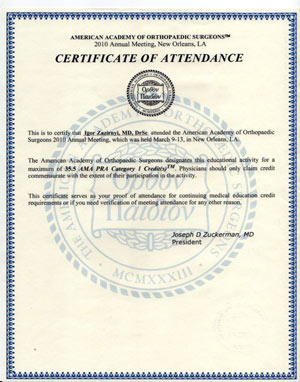Сертификат участника конгресса Американской Академии Ортопедической Хирургии, март 2010 год, Нью-Орлеан, США