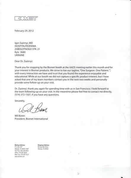 Письмо президента компании Биомет