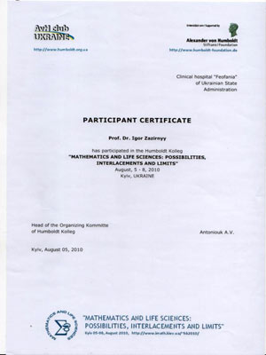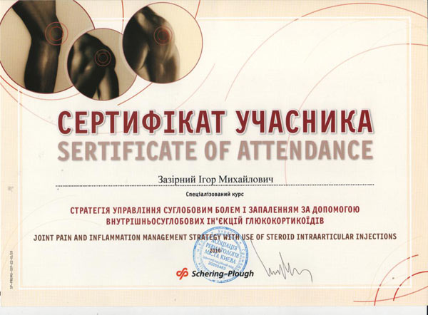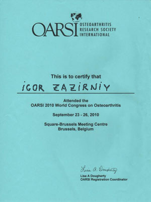 Диплом участника конгресса международного общества исследования остеоартрита, Брюссель, Бельгия, сентябрь 2010